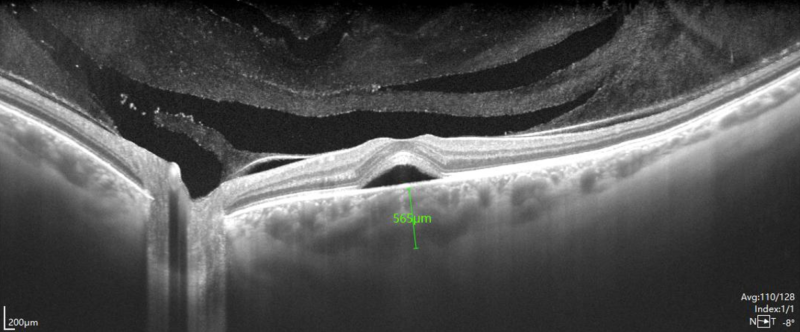 L’imagerie par OCT permet de détecter soit un épaississement de la rétine, soit la présence d’anomalie dans ou sous la rétine (œdème, néovaisseaux, atrophie, membrane…)